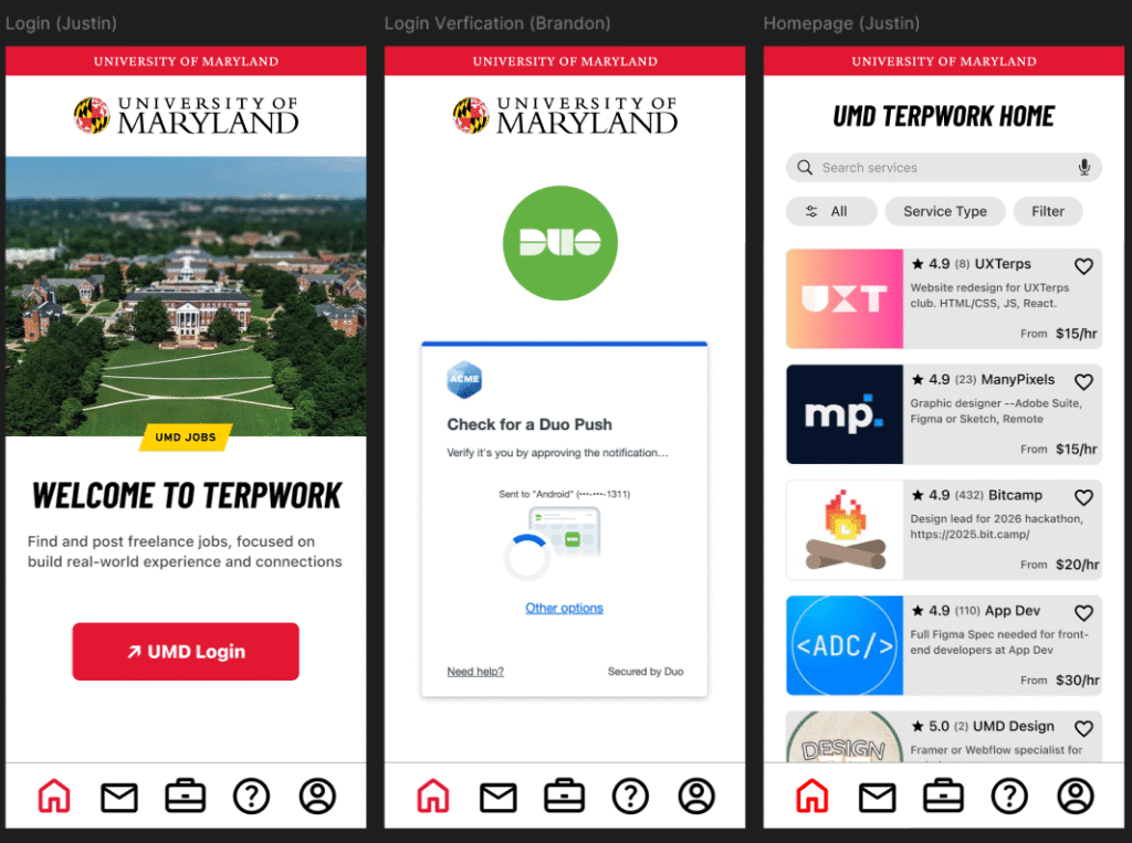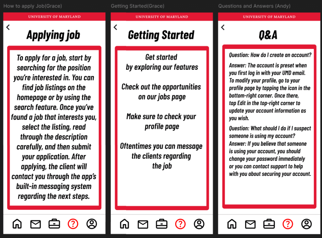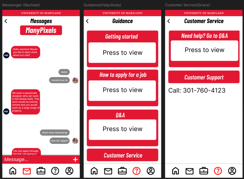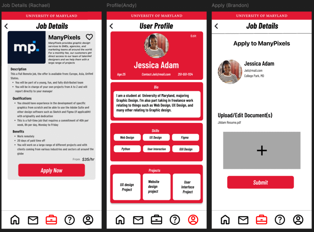 The goal was to create an app that would help University of Maryland students specifically. Originally, we wanted to focus on a construction app, but due to some of the logistical challenges, we decided to shift to a job search app that is tailored to the creative tech majors. The low fidelity prototype focuses on how we wanted our screens and icons laid out. Then when we shifted to the final prototype, we added colors and text that matched the University of Maryland theme/brand.
