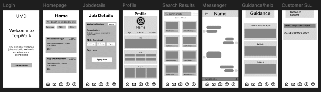 This is TerpWork. Created by me and my group members: Justin, Brandon, Rachael, and Andy. The image below is the low fidelity prototype. I worked on the customer service slide for this particular one. For the more final prototype, I worked on the customer service slide, the how to apply to jobs slide, and the getting started. For the first prototype, we focus on making the color scheme in grayscale to get a general layout of how the app should be.
