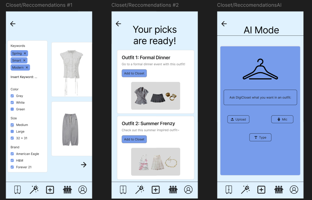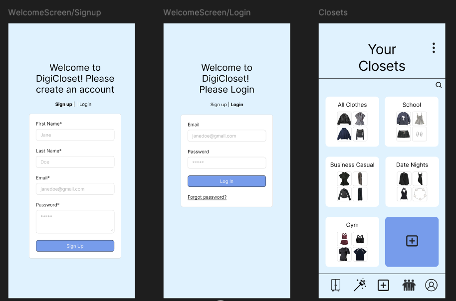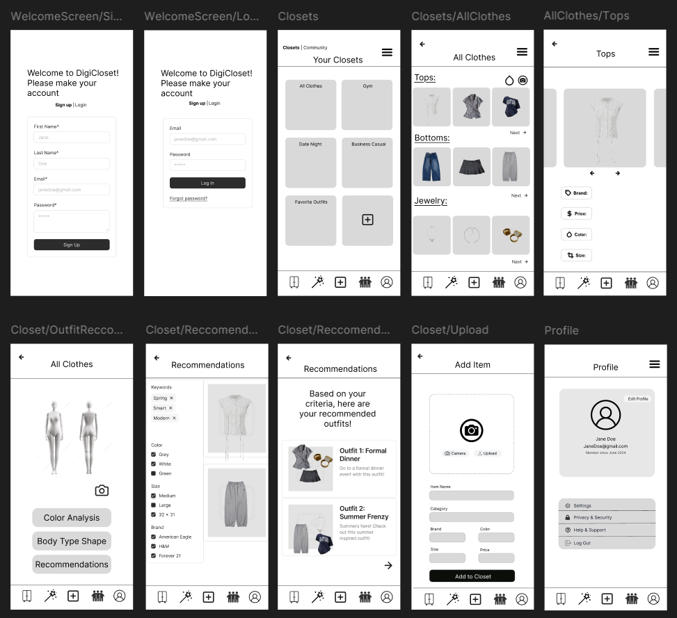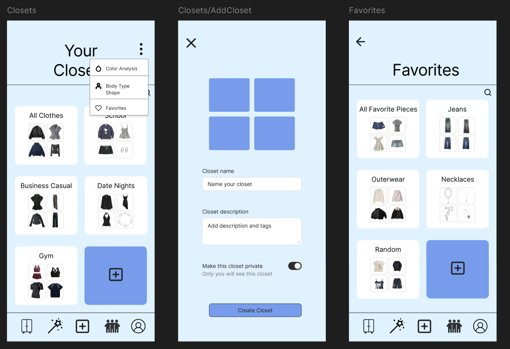 This app is about creating a tailored digital closet for users. https://www.figma.com/proto/oWkfg7tE4V2Z2vfZmx4wbZ/Prototype?node-id=256-297&t=GQnbHUKBKmpu8pT9-1