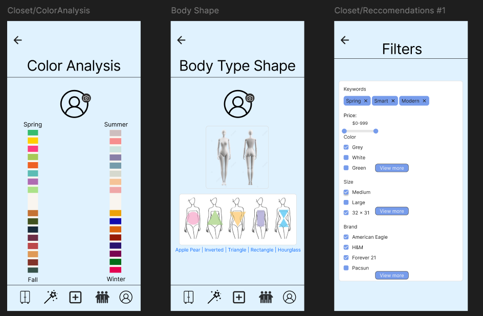 The goal was to create a fashion app that gave users custom saved clothing suggestions. Our app unique by the fact that we offer color season analysis and body shape type analysis to give clothing suggestions. Those two slides and ideas were my main ideas. It made our app stand out from any of the existing fashion closet apps on the market. Thus, I worked on those slides for the final prototype as well as the clickable aspect.