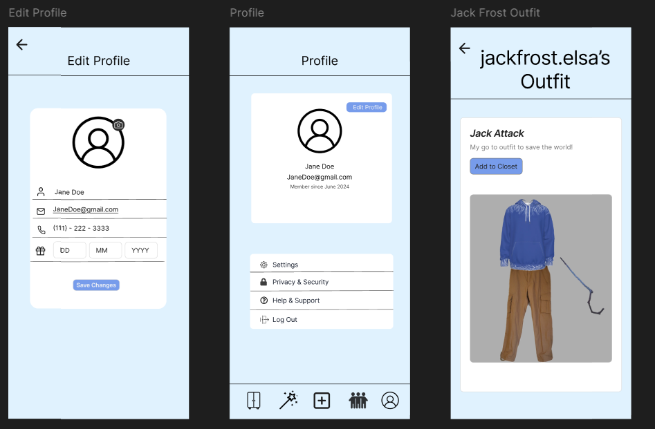 DigiCloset was created by me and my group members: Bethany, Immy, Nikki, and Sophia. The image below is our initial grayscale prototype. It set the foundation before we decided on our color scheme. We did user testing by interviewing our peers on a potential fashion app. Within the busyness of young adult life, many people struggle with coming up with outfit ideas and what to wear.